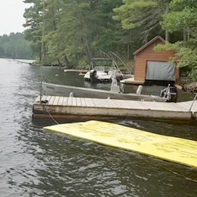 A woman runs on a dock in a lake and jumps over a gap to get to another dock, but she slips when she lands and falls into the edge of the dock.