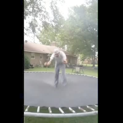 A woman jumps off a beanbag onto a treadmill that is already on and he falls down. The treadmill pulls her shorts off and then shoots her off the back.