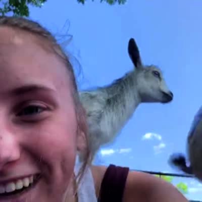 A woman does goat yoga and two goats jump onto her back but one jumps on her head and she laughs.