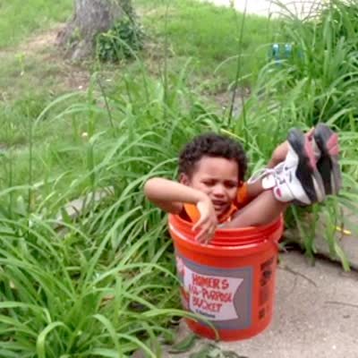 A young boy rides in a toy wagon down a hill and hits a tree. He laughs and says that his "wiener" didn't hit it.