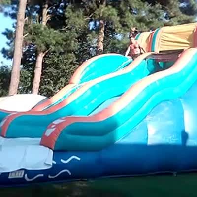 A man jumps on an inflatable water slide in a yard and bounces off the slide and lands on the grass.