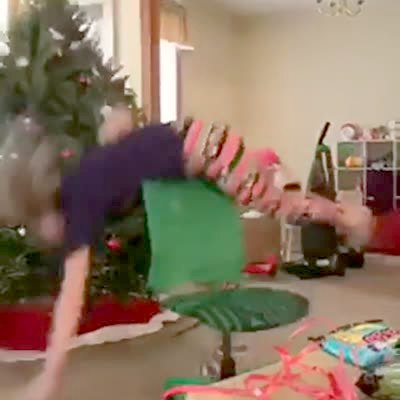 A teen girl falls off of a chair in a living room and a Christmas tree falls on top of her.