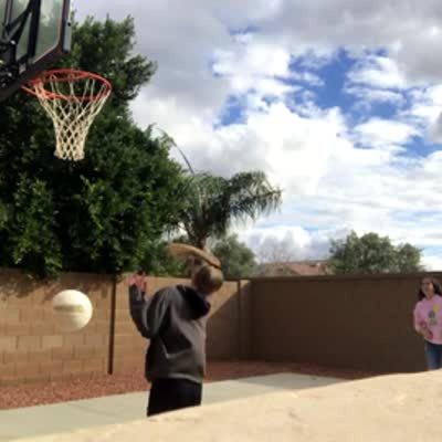 A teen girl smacks a volleyball, it bounces off a basketball goal and smacks her in the face.