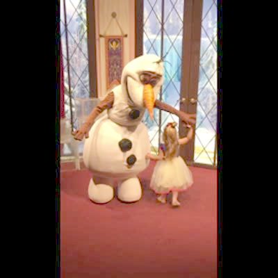 A person in an Olaf costume falls while they twirl around with a young girl at Disneyland.