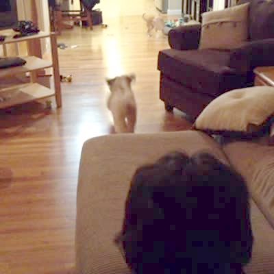 A pug plays fetch in the house. Gets the ball stuck in her mouth. She won't let man help her. Start at 0:34.