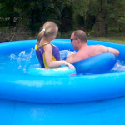 A man and his young daughter make waves in a pool and the man accidentally kicks her out of the pool.