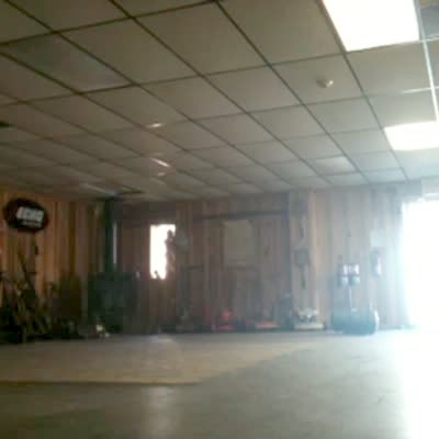 A man rides around a garage in circles on a scooter. He crashes into the camera and knocks it over.