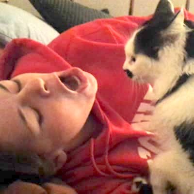 A woman sings badly and her cat sticks its head in the woman's mouth indoors.