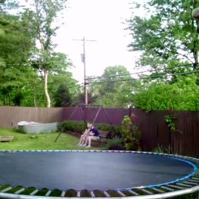Teen boy jumps off patio post onto a trampoline and gets caught in the edge of the net. Stunt.