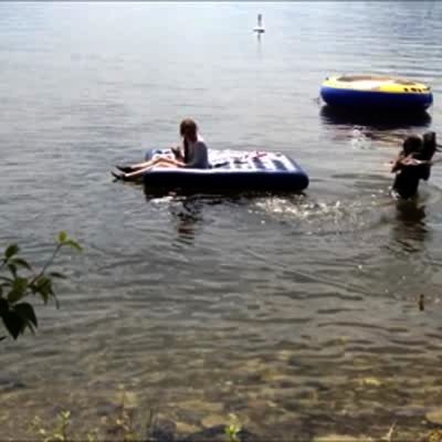 WOMEN OVERBOARD Woman holds girl's legs to ease her into water, they both topple off boat