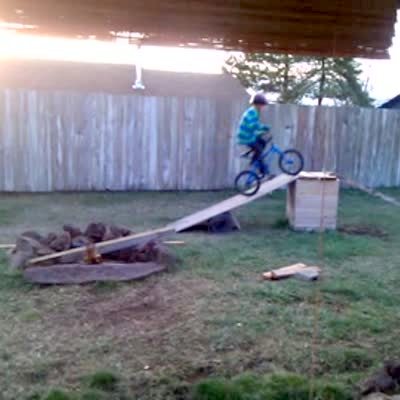 A boy rides his bike up a ramp then falls off the side of it outdoors.