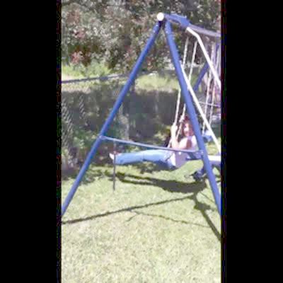 A girl is swinging on a backyard swing set and the front part of her swing gets caught on a fence.