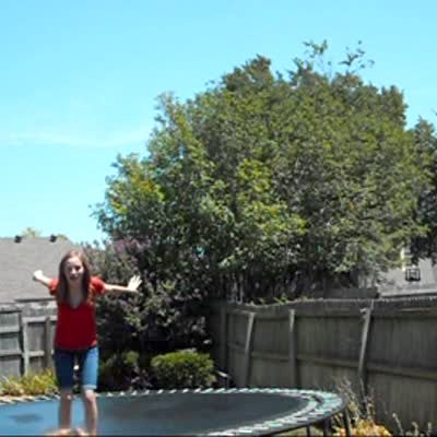 2 teen girls jump of trampoline, 3rd girl tries it and the trampoline breaks. Pieces fly everywhere, girl falls.