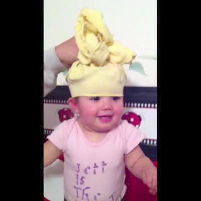 Tot girl repeats / says "banana" by sticking her tongue in and out. Cute.