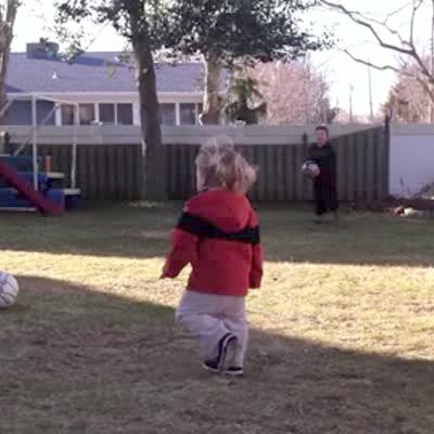 In a backyard, a tot girl kicks around a soccer ball. Her brother tries to kick a ball, slips on it, and falls to the ground.