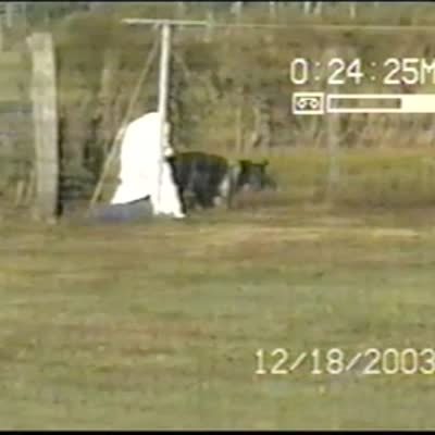 Horse tied to stable fence jumps back, pulls wood board off, it hits woman & knocks her down. Outdoors, barn, farm.