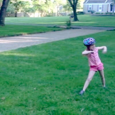 A girl cries while riding a bicycle outdoors, then screams, "I did it!" and cheers, running around and screaming.