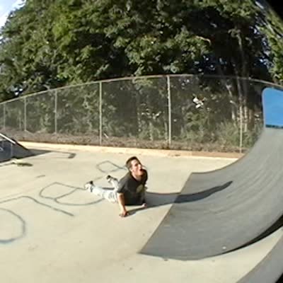 A teenage boy falls and hits his face skateboarding down a ramp outdoors.
