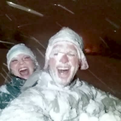 A man and a woman record themselves playing in snow and sliding down a sled outdoors in the winter. The man's face gets covered in snow.