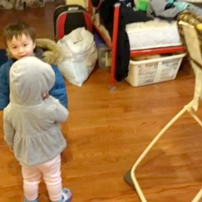 Tot boy rocks/scoots playpen across hardwood living room floor.