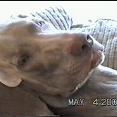 A golden retriever dog steals bread off of a kitchen counter over and over again as the boy behind the camera encourages her. Action starts at 3:12.