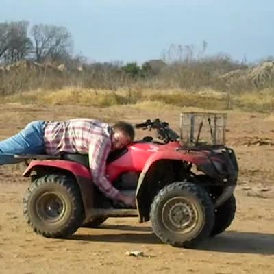 Young man jumps onto an ATV from behind and misses the seat. He hurts his groin.