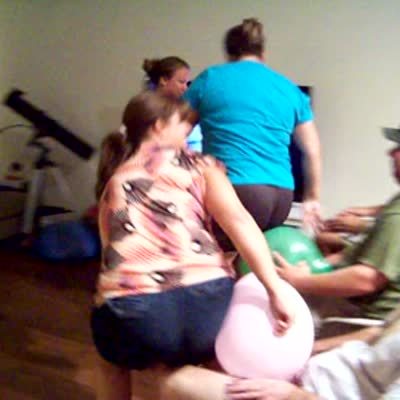 Three women sit on and pop balloons on husbands' laps in game at birthday party in living room, two mens' chairs break, husbands and wives fall down. Mishaps. Loud audio.