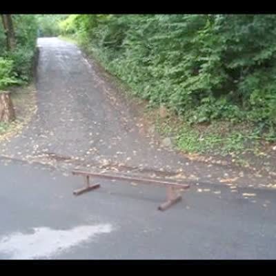 A boy is trying to jump on a pogo stick while on a small table outside. Has a good fall at 0:22 when trying for a third time.