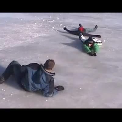 Several young men sled down a hill on a mattress, hit a jump, and slide on ice.