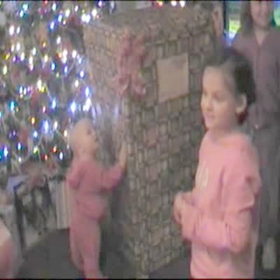 A military man surprises his three young daughters on Christmas while hiding in a Christmas gift. They open him at 1:13.