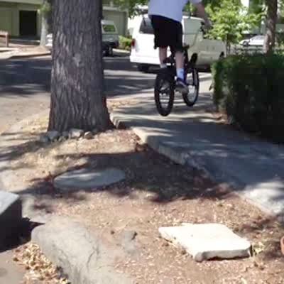 A young boy goes off of a ramp on a bike and lands in bushes.