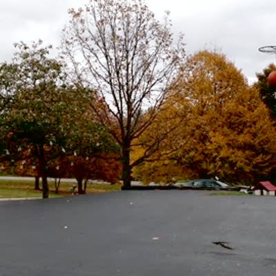 A teen throws basketball behind him while he holds a camera/phone and makes it. AA: Basketball Trick Shots