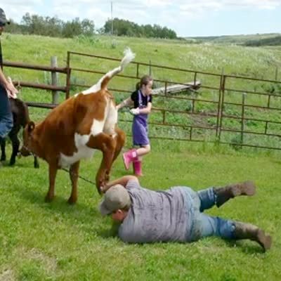A young girl walks a calf cow. The camera pans to show another calf cow as it jumps on a man on the ground.