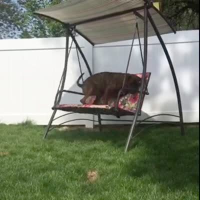 A dog tries to sit on a backyard swing, but falls off. The swing hits the dog on his butt and he jumps outdoors.