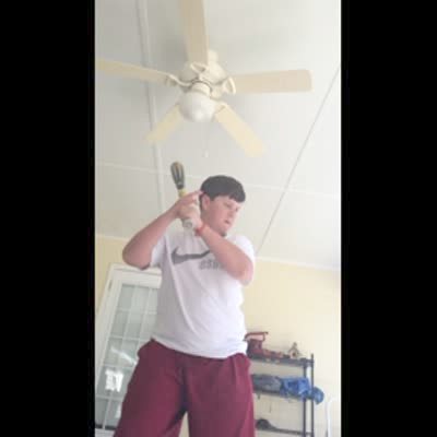 A young girl records herself flipping backwards on a bed. Her foot hits the ceiling fan and knocks off one of the blades.
