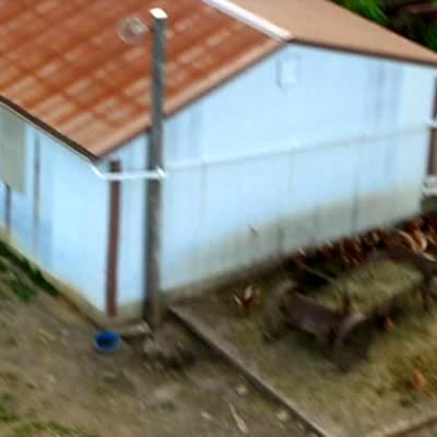 The people behind camera fly in a hot air balloon, scaring a near by barn of cows and chickens into a wall.
