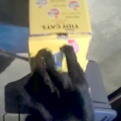 A cat stands on top of a box indoors trapping another cat in it. Action at :40.