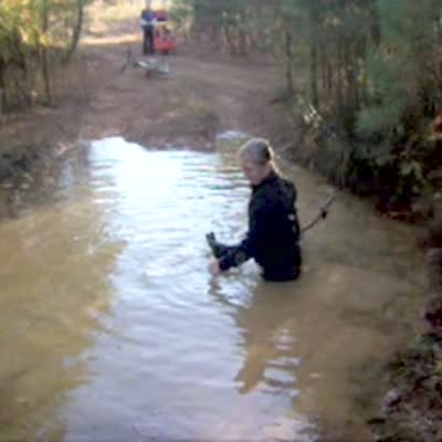 Two girls try to go through a puddle on bikes but the first face plants at :05 so the other girl stops short.