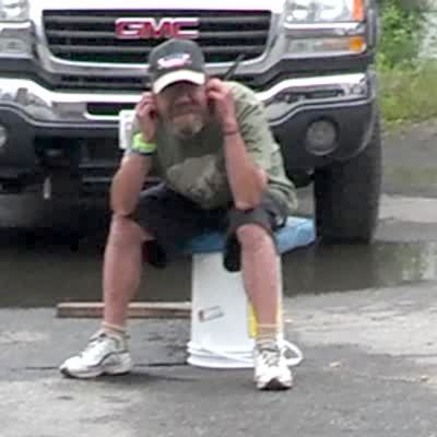 Elderly man sits on a plastic bucket that explodes as other man counts down. He goes flying off. Firecracker?