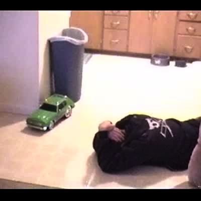 A young man lies on his stomach indoors as a remote controlled car runs at his head. Adults off camera laugh.