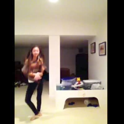 A young boy and young girl dance to Gangnam Style until the girl gets hit with a large ball that bounces and hits the camera.