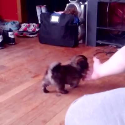 A hat moves around on the floor and a puppy dog pops out from underneath.