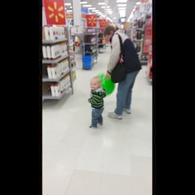 A man and a baby boy play with a big ball in a store. The baby falls into it and it pops at :31.