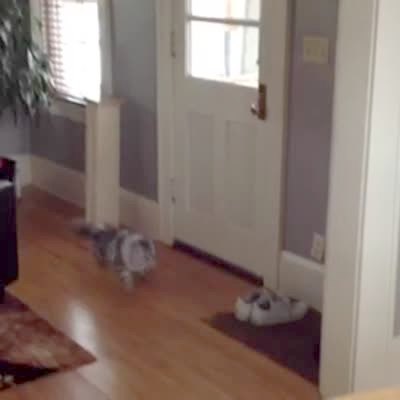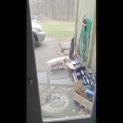 A cat attacks a door and windows, jumping on them to scare away a mailman.