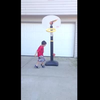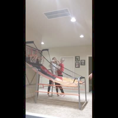 Young shoots a basket on a small toy basketball hoop and it falls on him.