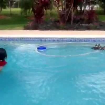 A young boy tries to push several ducklings out of a swimming pool outdoors and the mother duck attacks him.