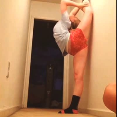 A teen girl stretches her leg against a wall and springs off, hitting her head against the opposite wall in the hallway at home.