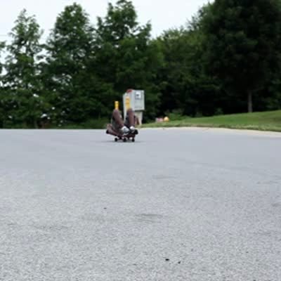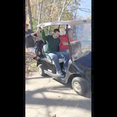 A man falls off of the side of a golf cart in slow motion outdoors.
