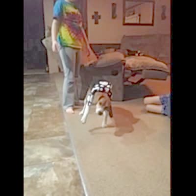 A dog wears a dress indoors and when a girl tells her to show of her moves, the dog sticks a leg up and falls over awkwardly.