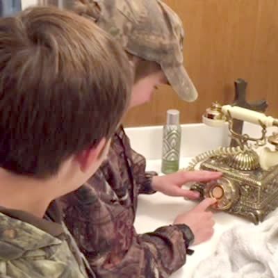 Two boys spin the dial on a rotary phone because they think it's a radio.